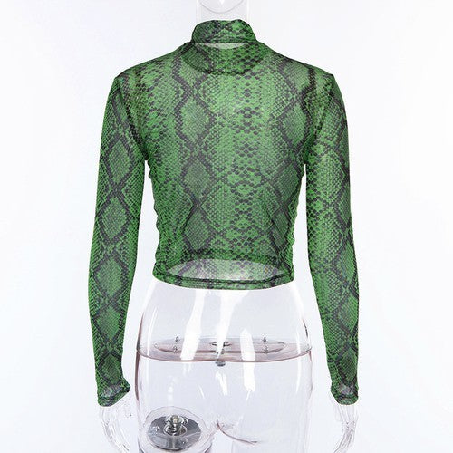 Snakeskin-inspired green mesh fabric. Long sleeves with stretch fit. Lightweight and breathable. Perfect for layering or wearing solo